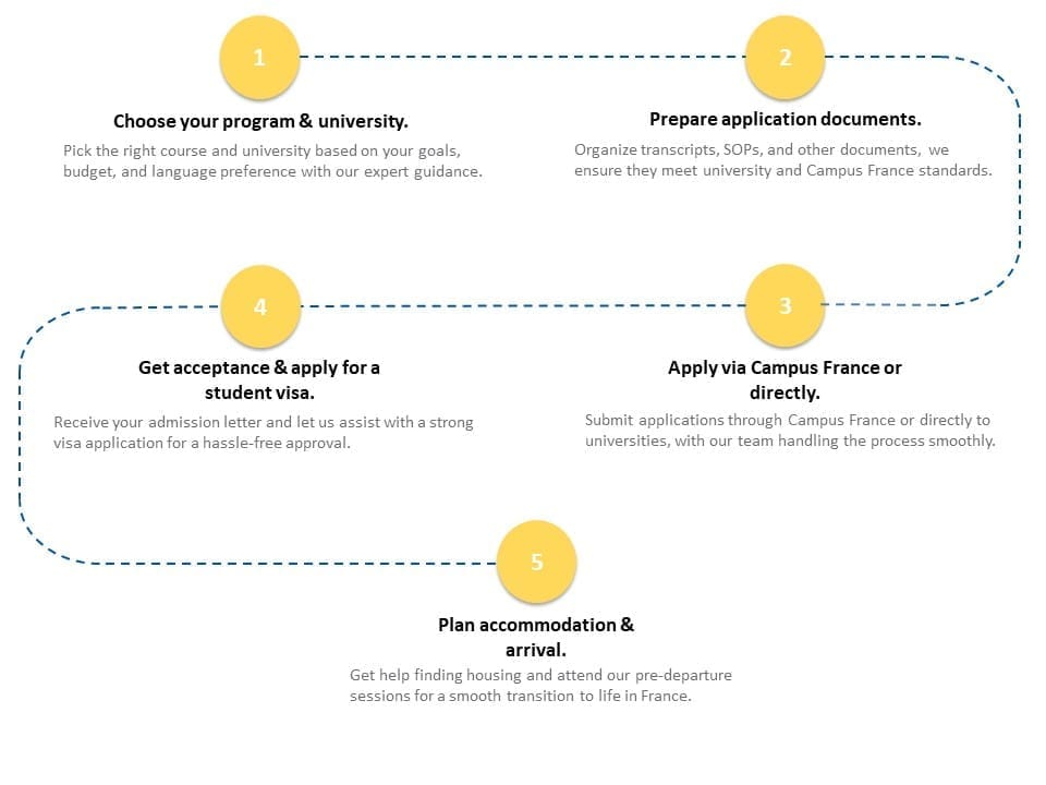 Our service includes scheduling your Campus France interview, offering mock sessions for preparation, and staying connected with you throughout the process. We track application progress and provide updates until you receive your results. Post-admission, we also guide you with next steps like basic visa information.